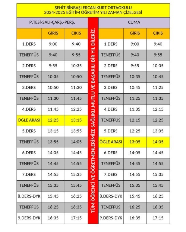 OKULUMUZ 2024-2025 EĞİTİM ÖĞRETİM YILI ZAMAN ÇİZELGESİ ALTTA YER ALMAKTADIR.